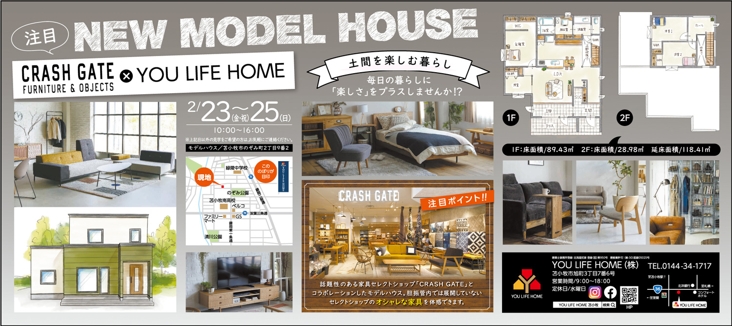 土間を楽しむ暮らし 話題性のある家具セレクトショップ「CRASH GATE」とコラボレーションしたモデルハウス 胆振管内では展開していないセレクトショップのオシャレな家具を体感できます
